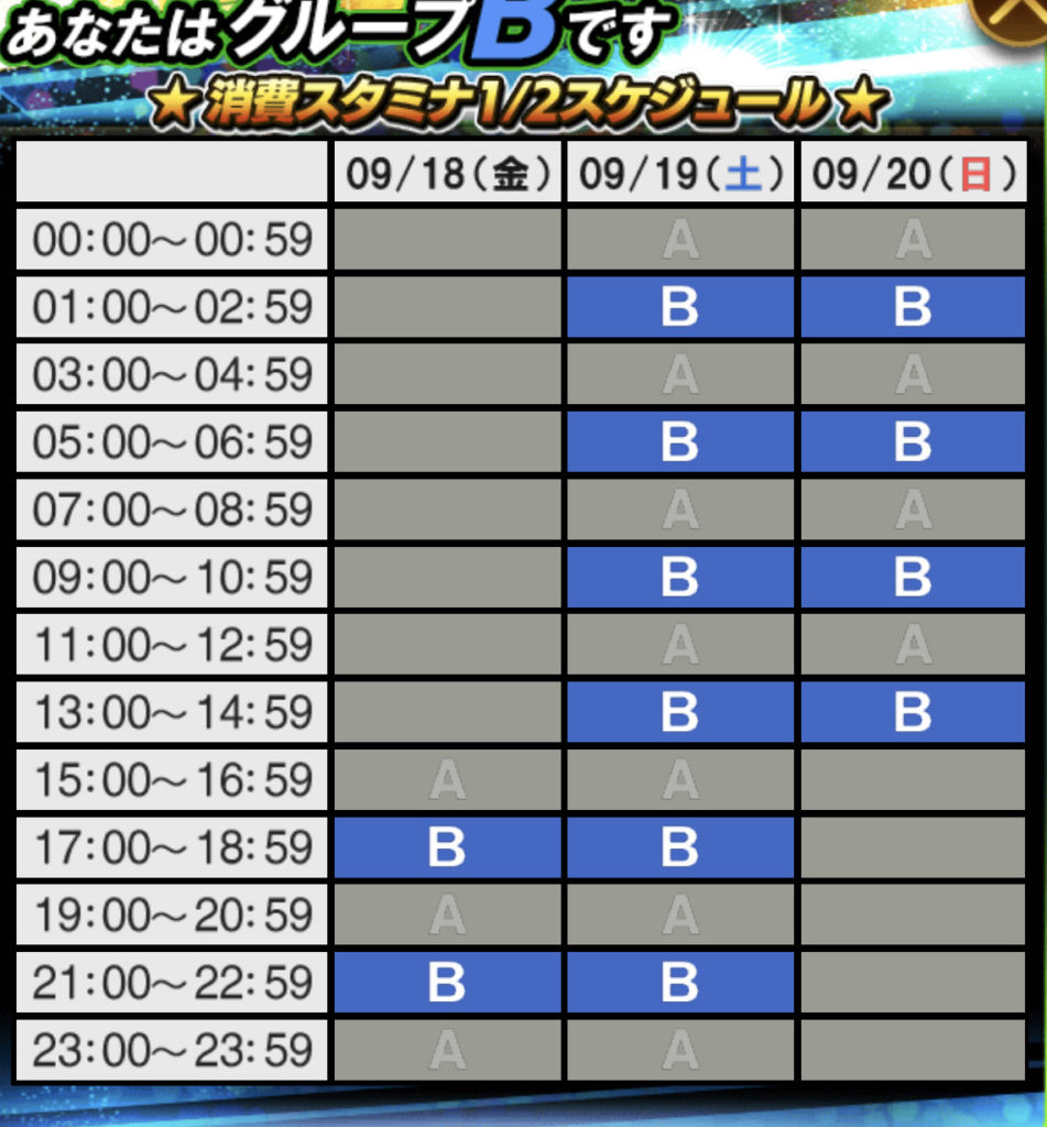 自分のグループと適用時間をしっかりと把握しておき、スタミナ半減が適用されていない状態で周回しないよう注意が必要です。